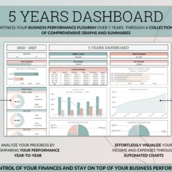 ✓ 5 years Dashboard (automated) – see an overview of your business over 5 years. Easily visualize your cashflow, your profit goals progress and compare your performance over 5 years.